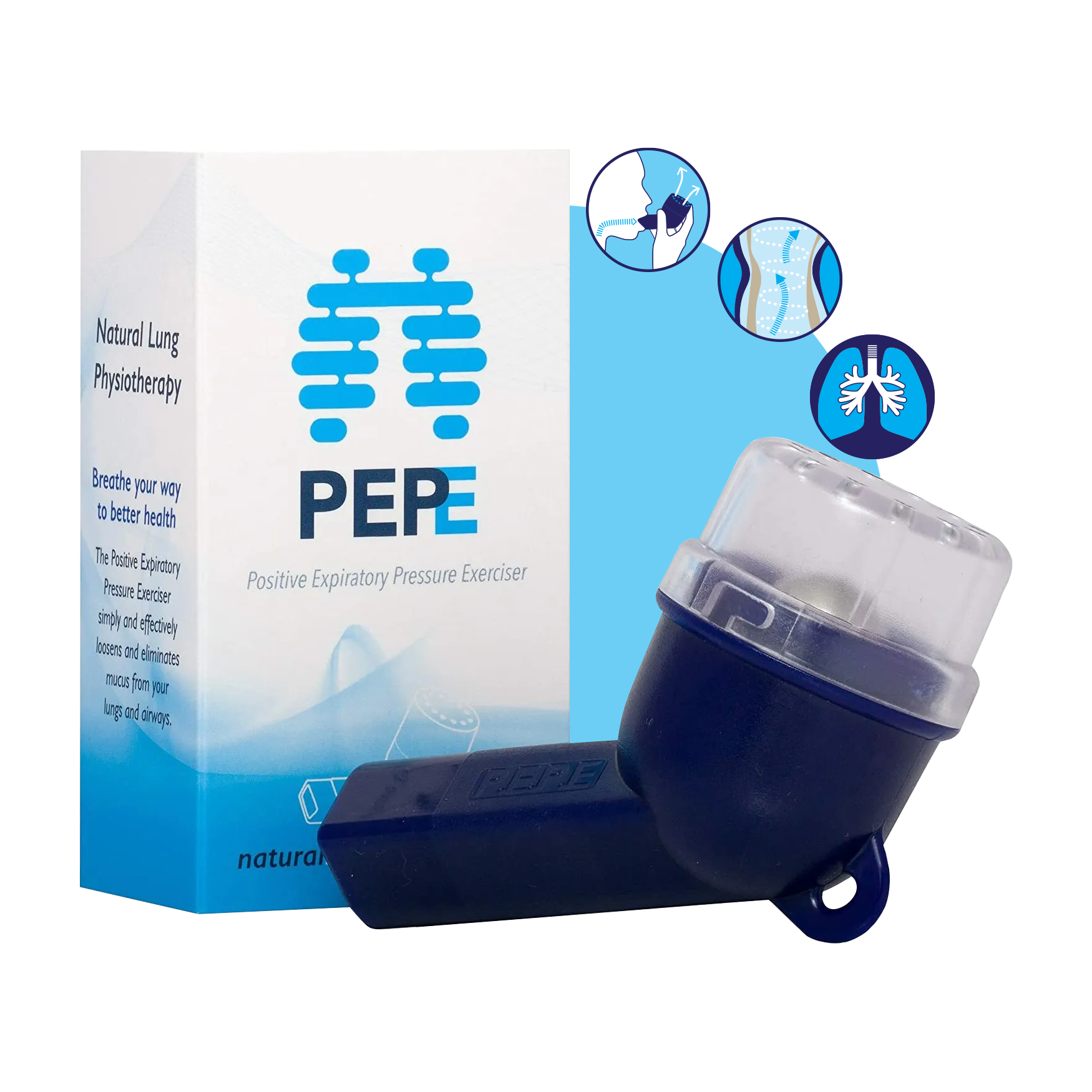 The PPEPE device effectively clears mucus from the airways and strengthens the lungs. The PEPE device can also be used as a lung exerciser that is suitable for athletes as well as physically active people to increase their lung capacity.